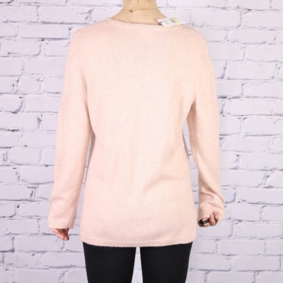 In perfect condition! This knit sweater is a super pretty peachy-pink light nude colour. It's really cozy. Has small side slits. For context, I wear a size S and I'm 5'7. 57% cotton, 43% acrylic