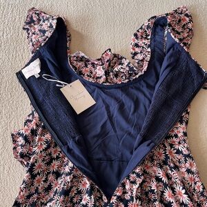 This brand new Charles Henry dress features a charming navy base with an all-over pink and white daisy print, ruffled sleeves, and a flattering fit & flare silhouette. Fully lined with a stretchy smocked back and side tie detail for extra comfort and adjustability. Lightweight and feminine, it’s perfect for garden parties, brunch, or a daytime wedding.