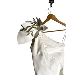 NWT Chiara Boni La Petite Robe Gosia One-Shoulder Gown in White Size 2 (IT 38) A floral detail sits atop the shoulder of this asymmetric ruched gown. One shoulder Sleeveless Pull-on style Keyhole detail at shoulder Ruched hip Wrap skirt Polyamide/elastane Hand wash Made in Italy Size & Fit Mermaid silhouette About 65" from shoulder to hem Model measurements: 5'10" tall, 32" bust, 23" waist, 34" hips Model is wearing a US size 4 Please note this was a floor model and has some marks on the hem area as such see pics