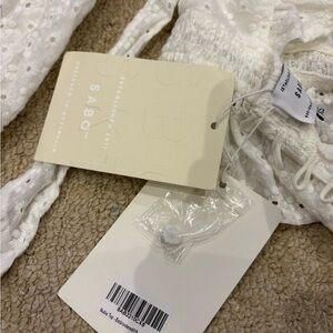 New with tags- This chic white blouse features intricate eyelet patterns and stylish ruffles. Ideal for elevating your wardrobe with a touch of elegance.