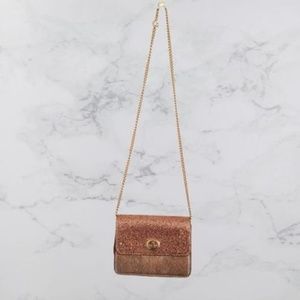 Beautiful rose gold sequins and leather evening purse. Buckle front closure and back pocket.