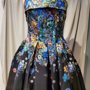 NEW WITH TAGS imported from England but ordered wrong size. From Julie Kuyath Limited Edition Collection. Printed structured waist mini dress with full skirt and vibrant floral pattern. Length 88.5cm