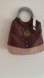 New with tags. Embellished with wooden and glass beads. Circle handle. Sumptuous chocolate brown over a shimmery pink/cream. Opening is 9”.
