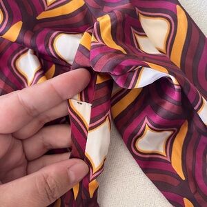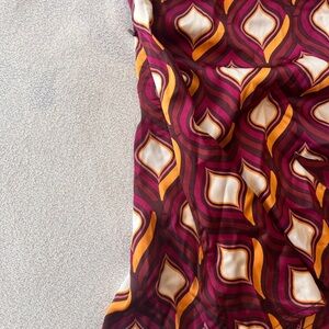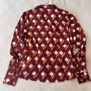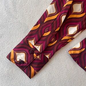 Make a statement with this eye-catching wrap blouse by Cupcakes and Cashmere, featuring a bold retro-inspired geometric print in rich tones of burgundy, orange, pink, and ivory.