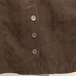 DESCRIPTION: A wear anywhere skirt with clean lines and cute details! Soft corduroy. Front tab pockets. Back slit with buttons. Belt loops. Button and zip front. Lined. BROWN