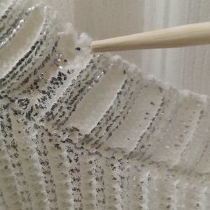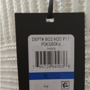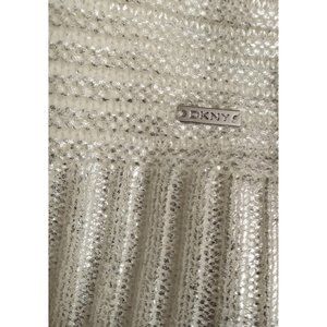 New with tags/never worn DKNY silver metallic coated ivory crew neck pullover sweater with drop shoulders, rib-knit panels in contrasting directions, rib-knit neck & cuffs. The shiny metallic coating is heavier in some areas than others giving it a modern look. Please see close-up photos for the metallic finish as this does not show up well in the main photos. This is a very nice sweater! *There is one tiny irregularity noted at top of back seam of neckband. Please see last photo. This is not a rip and there is no loose thread it's how the seam was finished by the manufacturer.* 100% Acrylic. Hand wash/Lay flat to dry. Size XL Approximate laid flat measurements: