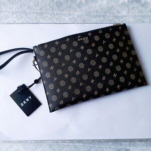 NWT DKNY black and taupe monogrammed large wristlet