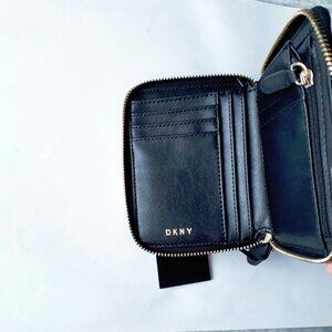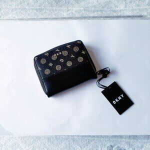 NWT DKNY black & taupe monogrammed Vela small zip around small wallet