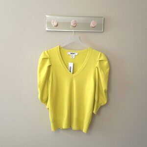 NWT DKNY lime lemon yellow puffed shoulder statement sleeve v-neck knit top, M