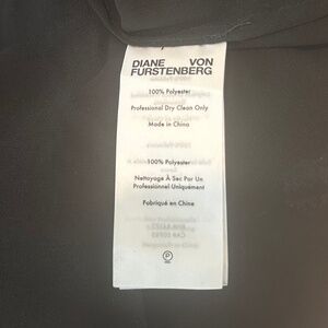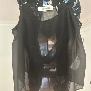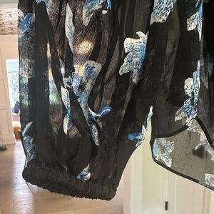 NWT - Gorgeous Diane von Furstenberg (DVF) black semi-sheer chiffon blouse with blue orchid print with black silk v-neck placket and shoulders, soft balloon sleeves, elasticized cuffs, partially lined with black sheer detachable cami. Can be dressed up with a satin skirt and heels, or worn with a pencil skirt and jacket for work. An incredibly versatile piece!