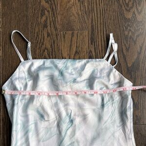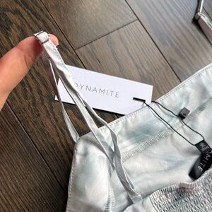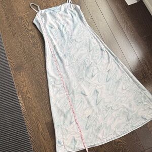 Stunning DYNAMITE midi dress with a white and blue marble pattern. Features a sleek silhouette and adjustable spaghetti straps.