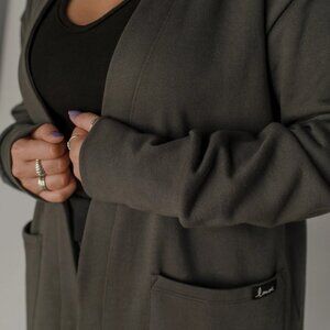 NWT Retro dark gray fleece cardigan. Made with a soft and comfy fleece fabric (100% Organic cotton) knitted in Canada. It has large ribbed cuffs. Pockets at the front and Louve label on the left. It is a four season piece. Perfect for layering.