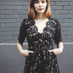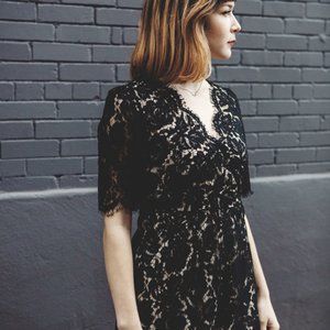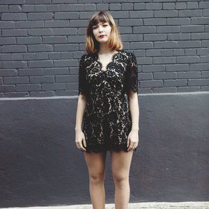 This super sweet romper is the perfect combo of playful and elegant. The stunning scalloped lace defines the v neckline. It is fitted at the waist, with a slight little flare through the shorts. Pockets! Exposed zipper in the back. 35% Cotton 36% Nylon 29% Viscose | 100% Polyester lining.