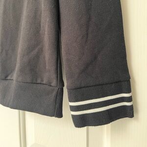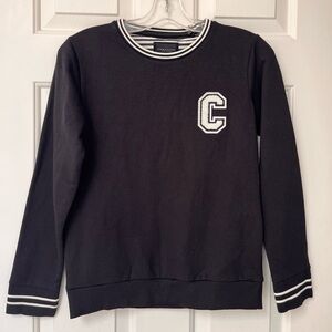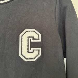 Brand new with tags! This varsity-style fleece sweatshirt by Denim & Flower Ricky Singh is the perfect cool-weather staple. Features a black body with sporty white striped ribbed trim on the collar and cuffs, plus a textured chenille “C” varsity patch on the chest. Soft brushed fleece interior makes it super cozy and comfortable.