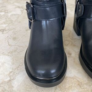 New Design Concept Studio black leather biker style boots. Super cool boots either way studded details, buckles and classic motorcycle harness design. These feature s 2” block heel and a side zipper so they’re more comfortable and easier to get in and out of.