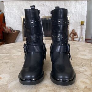 New Design Concept Studio black leather biker style boots. Super cool boots either way studded details, buckles and classic motorcycle harness design. These feature s 2” block heel and a side zipper so they’re more comfortable and easier to get in and out of.