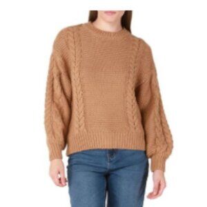 Woman's tan, crewneck, cable-knit sweater. Perfect for fall/winter!