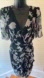 Vneckline. Elbow sleeves.Body hugging silhouette. Ruched drawstring detail at skirt.Hem hits above knee. Slipover style with zipper on skirt and snaps to secure wrap top style. Lined everywhere but sleeves. 100% silk.