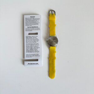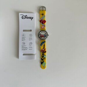 Disney Cars Plastic Time Teacher Watch. 32mm Clear Plastic Case, 16mm Yellow Cars 3D Rubber Strap, dial features Lightning McQueen And Raoul Caroule. Mineral glass crystal, stainless steel case back, Japan quartz movement, water resistance to 100 feet.