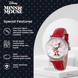 Disney Minnie Mouse Silver Vintage Style Watch for Ladies. Red leather strap 18mm, Mineral crystal, Stainless steel back, Japanese quartz movement, Water resistant 100 feet.