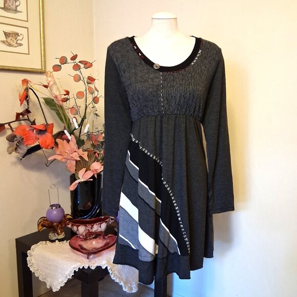 NWT Dolcezza Women's Unique Designed Long Sleeve Scoop Neck Gray Midi Dress XL