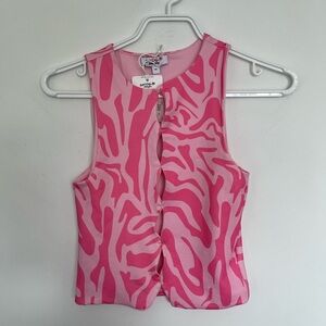 Stylish pink patterned sleeveless top perfect for any occasion. Slight openings , you can see skin throught, size XS NWT Stand out with its vibrant design.