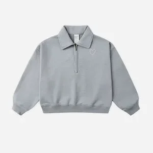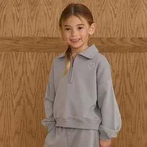 This fashionable matching set features a zip-neck sweatshirt and wide-leg pants made from lightweight and comfortable fleece. Designed for both style and practicality, it showcases a delightful heart embroidery on the front.