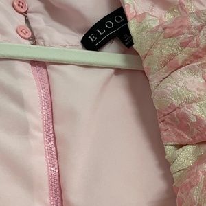 Beautiful pink and champagne gold puffed sleeve cropped jacquard top from ELOQUII. Romantic, feminine and just a little dramatic, works just as well with a high waisted skirt as a pair of jeans. Back zip and neck button, elasticated at the back waist.