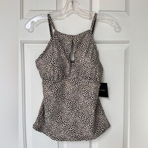 Flattering and functional Ellen Tracy swim tankini top in a chic “Wheat” black-and-beige spotted print. Features a front keyhole neckline, adjustable spaghetti straps, ruched bust and waist for a smoothing effect, and full lining with soft cup inserts. Perfect for swim, resort, or styled with shorts for a beachside look.