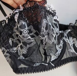 NWT European floral embroidered lace mesh underwire bralette black white 32B