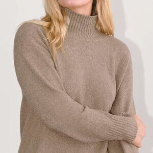 This piece features a relaxed, short fit, elevated turtleneck with dropped shoulders, ribbed detailing, and made from a blend of RWS-certified wool, GRS-certified recycled nylon, and certified organic cotton which makes it both cozy and stretchy.