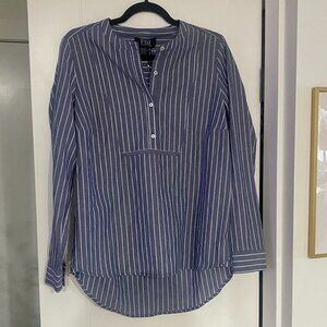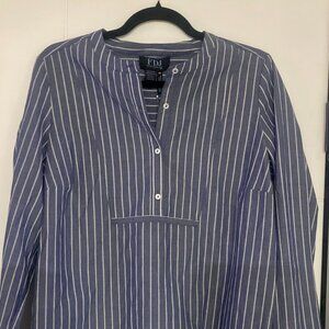 Blue and white pinstripe FDJ French Dressing tunic blouse in size 6. This beauty is NEW, 1/4 button up, longer back side, with a stand or band collar.