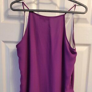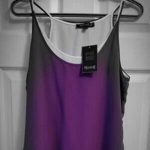 Beautiful FEMME deep violet tank with white underlayer that is assymetrical. Spaghetti straps. The third picture shows the color at its closest to the real thing. There is no fading or shading on this top.
