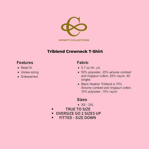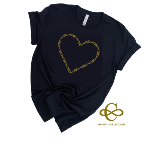 Infinity Collections black t-shirt is soft and comfort. It comes in multiple sizes ranging from XS to XXL. Graphic design is a GOLD vinyl. Material is 50% cotton, 25% polyester, 25% rayon. See photos for size chart and more details.