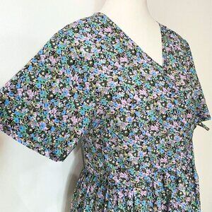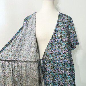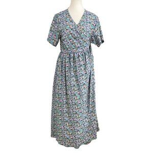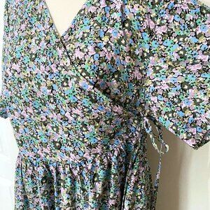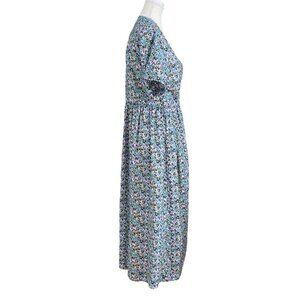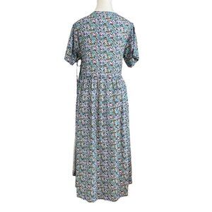NWT FRANK AND OAK THE PRINTED LOOSE DRESS IN LILAC BLUE COLORS - A statement piece that's both chic and comfortable. This summer must-have is made with a blend of TENCEL™ Lyocell, an ideal fabric for the warmer months. Wrap cord for the waist. Short sleeve length. Long dress - maxi length - plunge v-neckline - unlined - lighweight - flowy - casual between a boho / peasant and casual dress for summer and spring - wedding guest dress to a brunch with friends. Baby shower to family reunion- versatile- pastel colours mixing blue lilac and green.