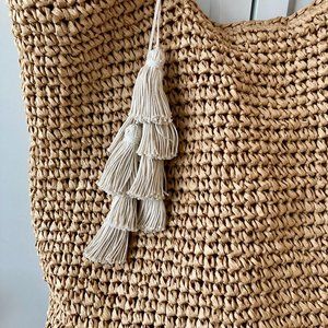 This oversized Woven Straw Tote is the perfect bag for your summer beach days. Take this packable and chic tote with you to the beach, pool, or around town. Fits everything and more and folds down flat perfectly into a suitcase for traveling. Eco - leather suede cord wrapped handles and bone cord non-fraying tassels are added to this bag as the perfect accoutrements.