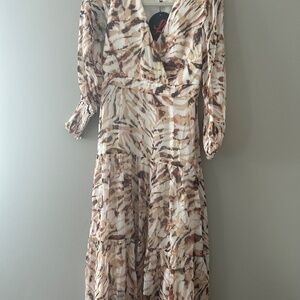 Lovely light hi low hem lined boutique maxi dress in earth tones xs Ptp 16” smock cuffs belt included.