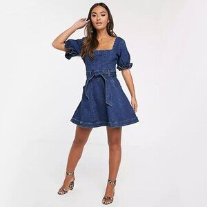 NWT Finders Keepers dark blue wash denim puff sleeve belted mini dress