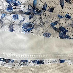 Beautiful blue floral fit flare dress. Zipper closure at back with waist ties. Ruffle cap sleeve. V-Neck. Lined so no slip needed keeping this dress cool and lightweight on hot summer days.