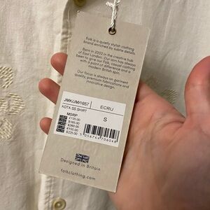 Brand new with tags. Regular $260. Kota SS shirt in Ecru by Folk. Linen blend. Button closure. Collar. Embroidered flowers on the front. Stock photo for fit reference only. Size small.