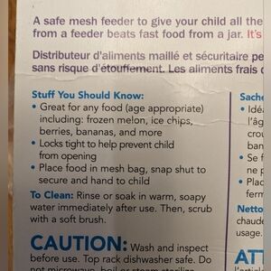 Great for any food that is age appropriate for your baby including: frozen grapes, frozen melon, ice chips, carrots, squash, turkey, chicken and more. Place food into mesh bag, and snap shut to secure. To Clean: Wash in warm soapy water and rinse thoroughly, or place in top rack of dishwasher. Use a toothbrush to remove food particles from mesh bag. While the bright colored mesh will help hide food stains, certain foods, such as carrots or berries, may cause mesh to discolor. Discoloration will not affect the performance of the feeder.Uses:Ideal for home or travel - the Fresh Food Feeder will become baby's best friend. Baby will enjoy the great flavor, nutrition and goodness of whole food - while reducing the risk of choking. Ideal for fruits and veggies. Easy-grasp handle. For ages 6 months plus. This Product Does Not Contain PVC With Phthalates.This item is not a toy. Never leave child unattended while eating or drinking. Always inspect Fresh Food Feeder after each cleaning and before each use. Always check that the snap-tight lock is secure. Discard and replace item at first sign of wear or damage. This item is not a pacifier and should never be used as one. When baby is finished with the feeder, take the feeder out of reach.