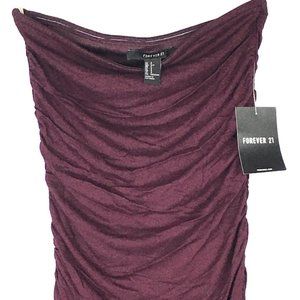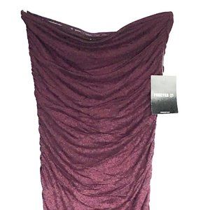 New with Tags Size Small Forever 21 Burgundy Strapless Form Fitted Knit Midi Dress. Featured outer Rouging with slightly raised left and right side hem. Fully lined. 100% Polyester.
