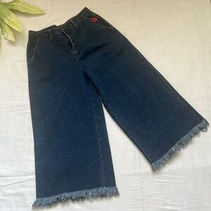 A pair of jeans featuring a wide-leg silhouette high-waist fit front and a cropped frayed hem.