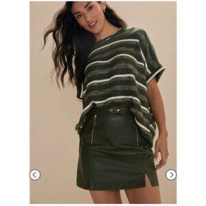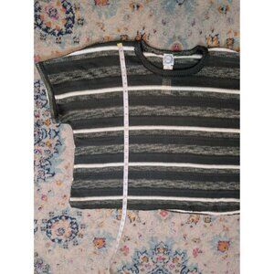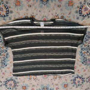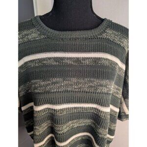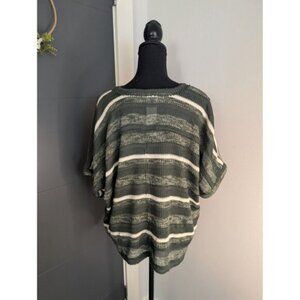 A slouchy semi sheer knit top in a dark green and white stripe with dolman sleeves and a raw hem.
