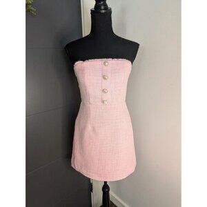 An adorable pink tweed strapless mini dress with pearl and gold tone heart shaped buttons and fitted waist.