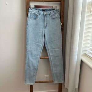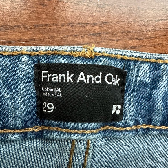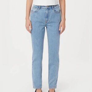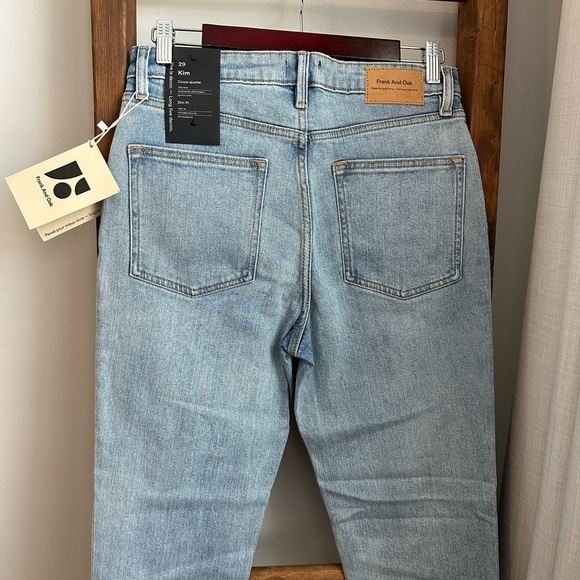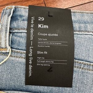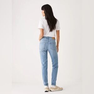 Frank and Oak "The Kim" high-rise slim jeans in a light indigo wash.