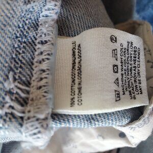 The denim wash is light blue and the buttons are a grey/tan tortoiseshell. Both the front and back pockets are functional. Machine wash and dryer safe!