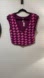 Vibrant knit top with a deep V-neck. Features a bold pink and purple checkered pattern. Sleeveless design for a chic look.