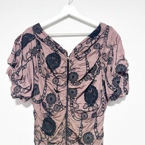 This chic women's mini dress features a ruched design with elegant floral embroidery. The soft mauve color is beautifully accented by intricate navy patterns, making it a stylish choice for any occasion.