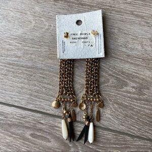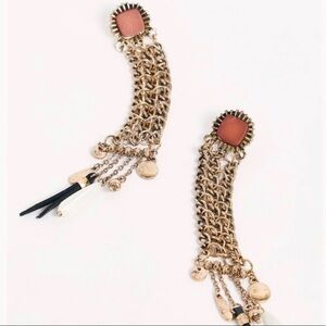 Make a statement in these stunning dangling earrings featuring a semi-precious stone stud with chain details and charms at the ends.